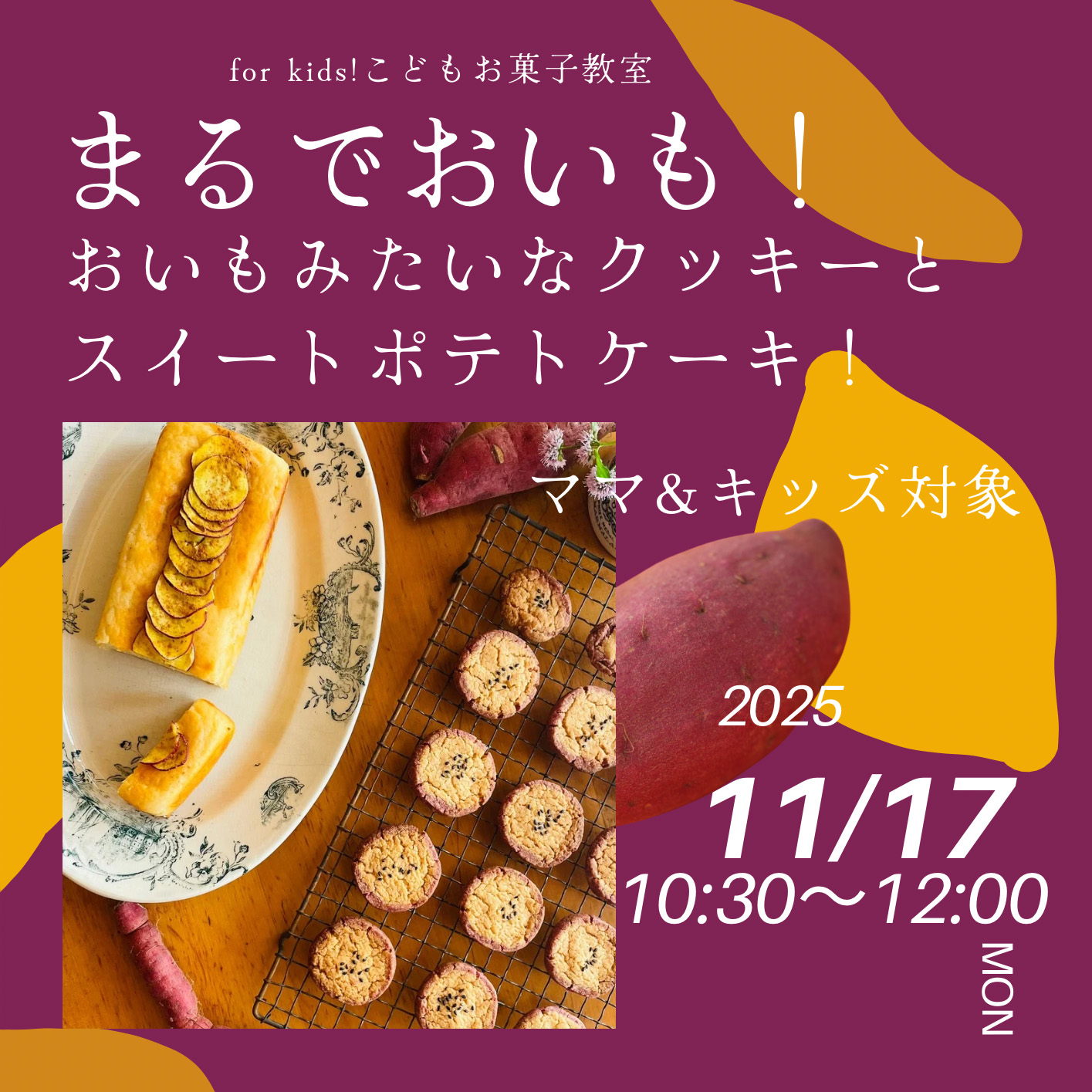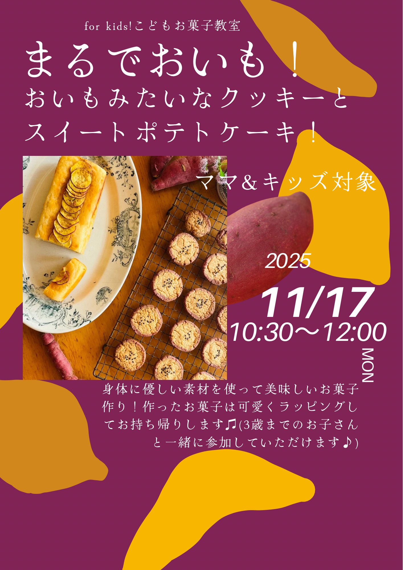今回のテーマは「まるでおいも!」。 おいもみたいなクッキーとスイートポテトケーキを作ります。 身体に優しい素材を使って美味しいお菓子作り! 作ったお菓子は可愛くラッピングしてお持ち帰りしましょう♫