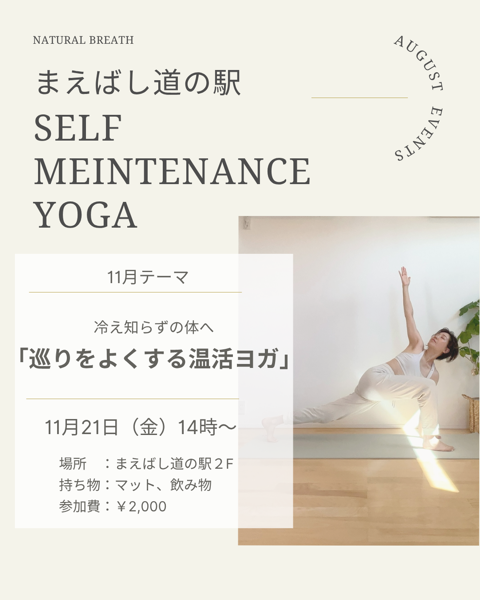 \10年後の自分が、今の自分に感謝したくなる/ ― セルフメンテナンスヨガ ― 最近、体がだるい、太りやすくなった、よく眠れない…そんなお悩みはありませんか? 実は、これらの不調は日々の体の使い方や、ちょっとした習慣の積み重ねで変わっていきます。 この講座では、東洋医学をベースにしたヨガで心と体を整え、 ・朝スッキリ起きられる ・やる気がわいてくる ・軽やかに動ける体になる …そんな理想の自分に近づくお手伝いをします。 初心者にもわかりやすく楽しいレッスンなので、ヨガが初めての方も安心してご参加ください。