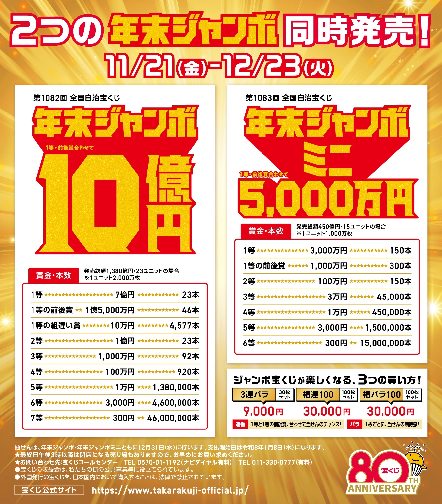 | 料金 | 各1枚 300円 当せん金一例 年末ジャンボ宝くじ 一等前後賞合わせて 10億円 2等 1億円 年末ジャンボミニ宝くじ 一等前後賞合わせて 5,000万円 2等 100万円 *抽せん日は、12月31日(水)。支払開始日は令和8年1月8日(木)になります。 当せんお調べは、お近くの宝くじ売場へお越しくださいませ。 買い方いろいろ ジャンボ宝くじが楽しくなる、3つの買い方! ★3連バラ バラで買いながら1等と1等の前後賞の両方をねらえる「少し欲張りな買い方」です。 ★福連100 下2桁00~99の番号が揃ってる「連番を満喫する買い方」です。 ★福バラ100 下2桁00~99の番号が揃ってることに加えて、さらに組番号が100種類揃っている 「バラがたっぷり楽しめる買い方」です。 ※連番/1等と1等の前後賞、合わせて当せんのチャンス! バラ/1枚ごとに、当せんの期待感! ※詳しくは、当日販売員におたずねくださいませ。 |