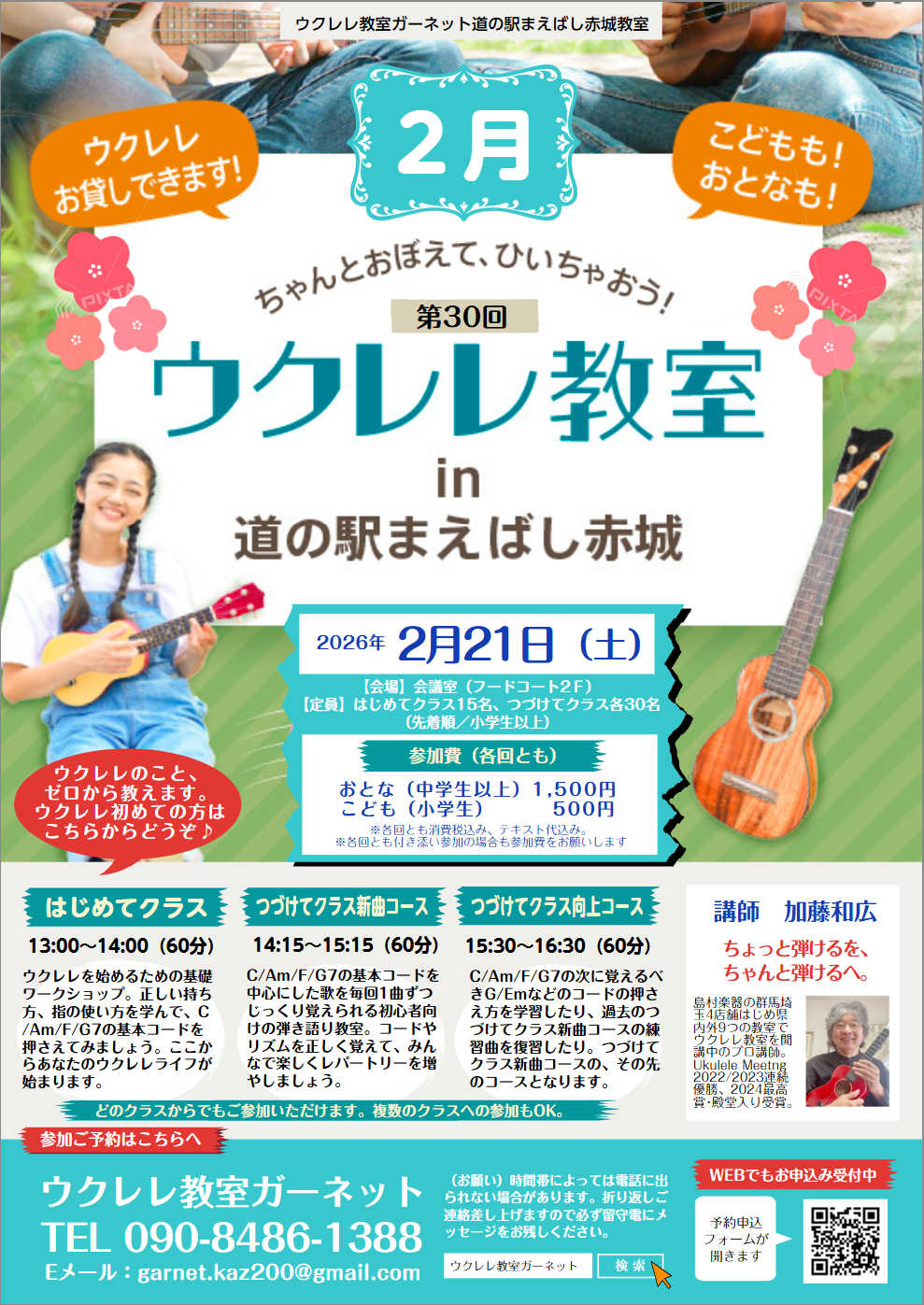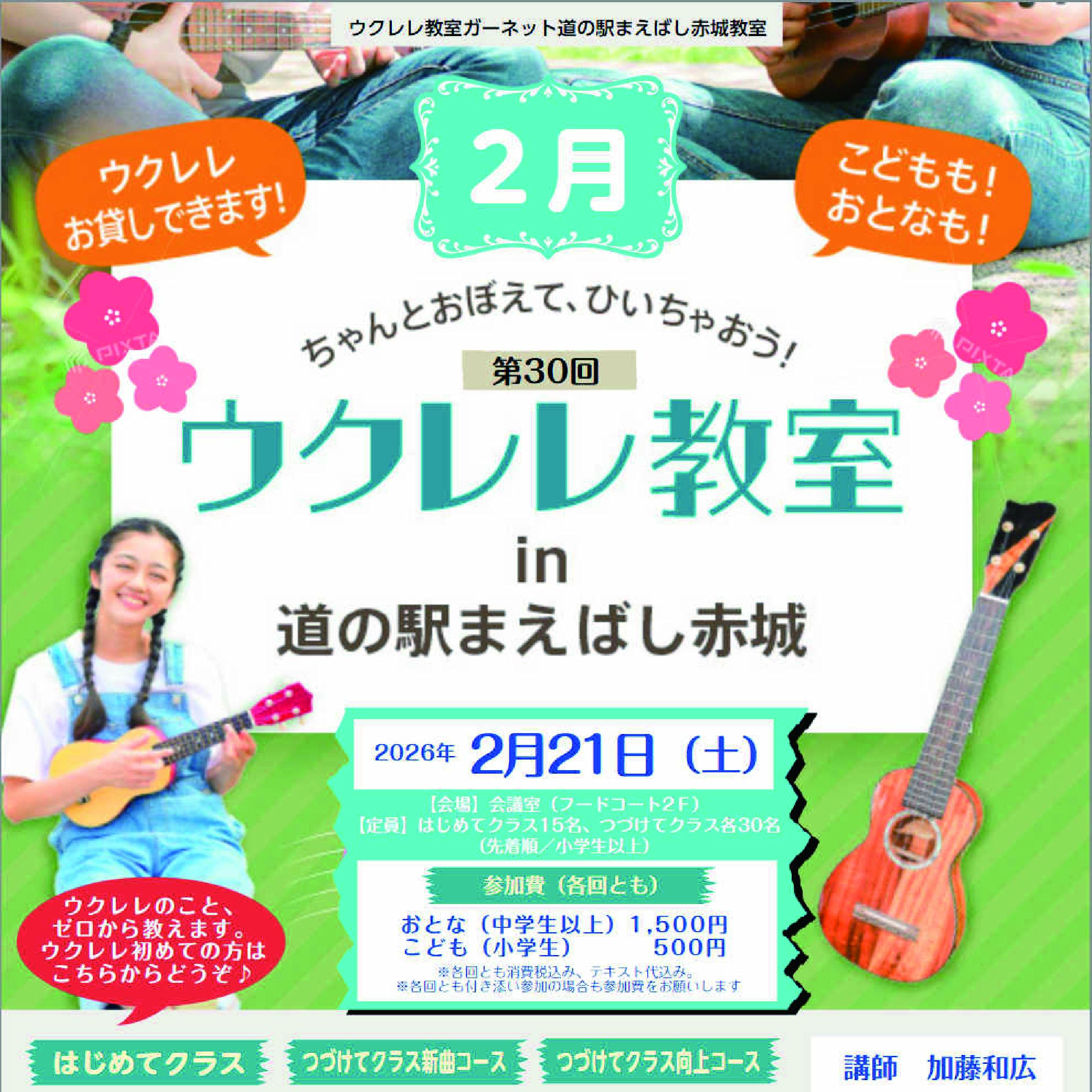 ウクレレの国内生産は約7割以上が群馬県! そこで!プロウクレレ講師「Ukulelegarnet加藤和広」先生による「第30回 ウクレレ教室in道の駅まえばし赤城」。 2023年6月にスタートし、2024年からは毎月第3土曜日に定期開催しているこの大人気ウクレレワークショップを、2026年も継続開催します。 「これからウクレレを始めようかな」という入門者の方から、「ちょっと弾けるよ」という初心者・初級者の方まで、段階別に3つのクラスを設けて開催。「ちょっと弾ける」を「ちゃんと弾ける」へと丁寧にご指導いただけます! キッズからシニアまでどなたでもご参加OK。キッズ&パパママ、じいじもばあばも、どうぞご一緒に!ウクレレを触ったことのない方ももちろん大歓迎!マイウクレレをお持ちの方はお持ちください。(ウクレレをお持ちでない方にはお貸しします!) お早目のご予約をおすすめします!