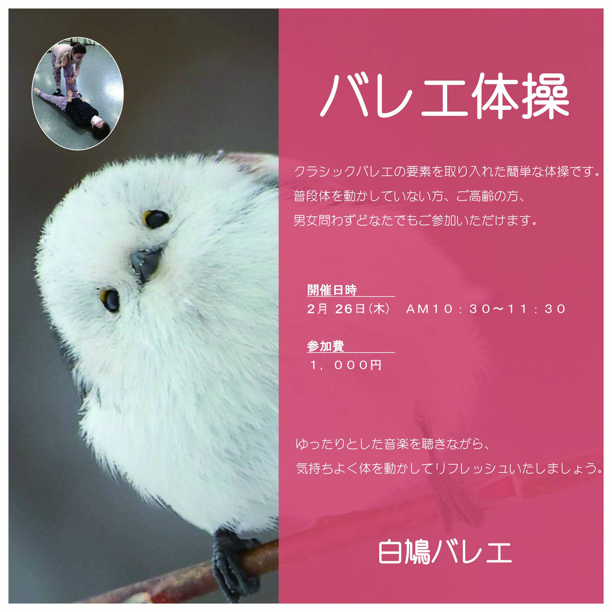 クラシックバレエの要素を取り入れた簡単な体操です。 普段体を動かしていない方、ご高齢の方、男女問わずどなたでもご参加いただけます! 心地よい音楽を聴きながら、楽しく身体を動かして、リフレッシュいたしましょう!