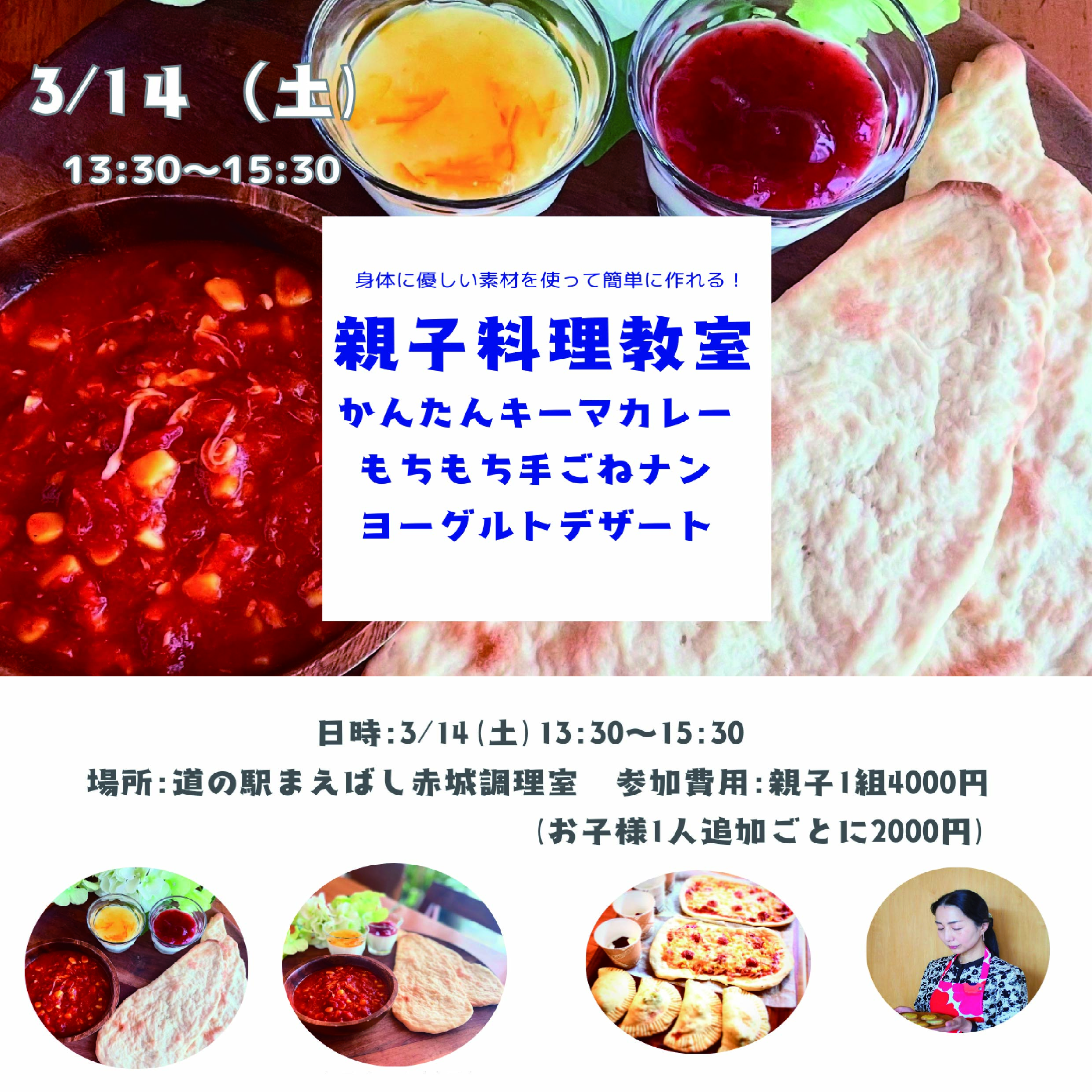 親子料理教室【親子対象】 2026/03/14[土] 2026/03/14[土] 概要・目的 身体に優しい素材を使って簡単に作れる! かんたんキーマカレー もちもち手ごねナン ヨーグルトデザート 開催日時 2026年3月14日(土) 13:30~15:30 場所 場所 道の駅 まえばし赤城 調理室 フードコート2階 料金設定 以下の通りの区分とする。 参加費用 親子1組 4,000円 (お子様1人追加ごとに2,000円) 定員 対象 3歳から小学生の親子(お父さんもOK) 持ち物 エプロン、三角巾、ハンドタオル、マスク、紙袋 予約方法 LINE ご予約、お問い合わせは こちら から 告知フライヤー 親子料理教室