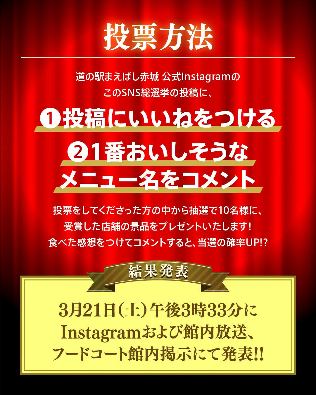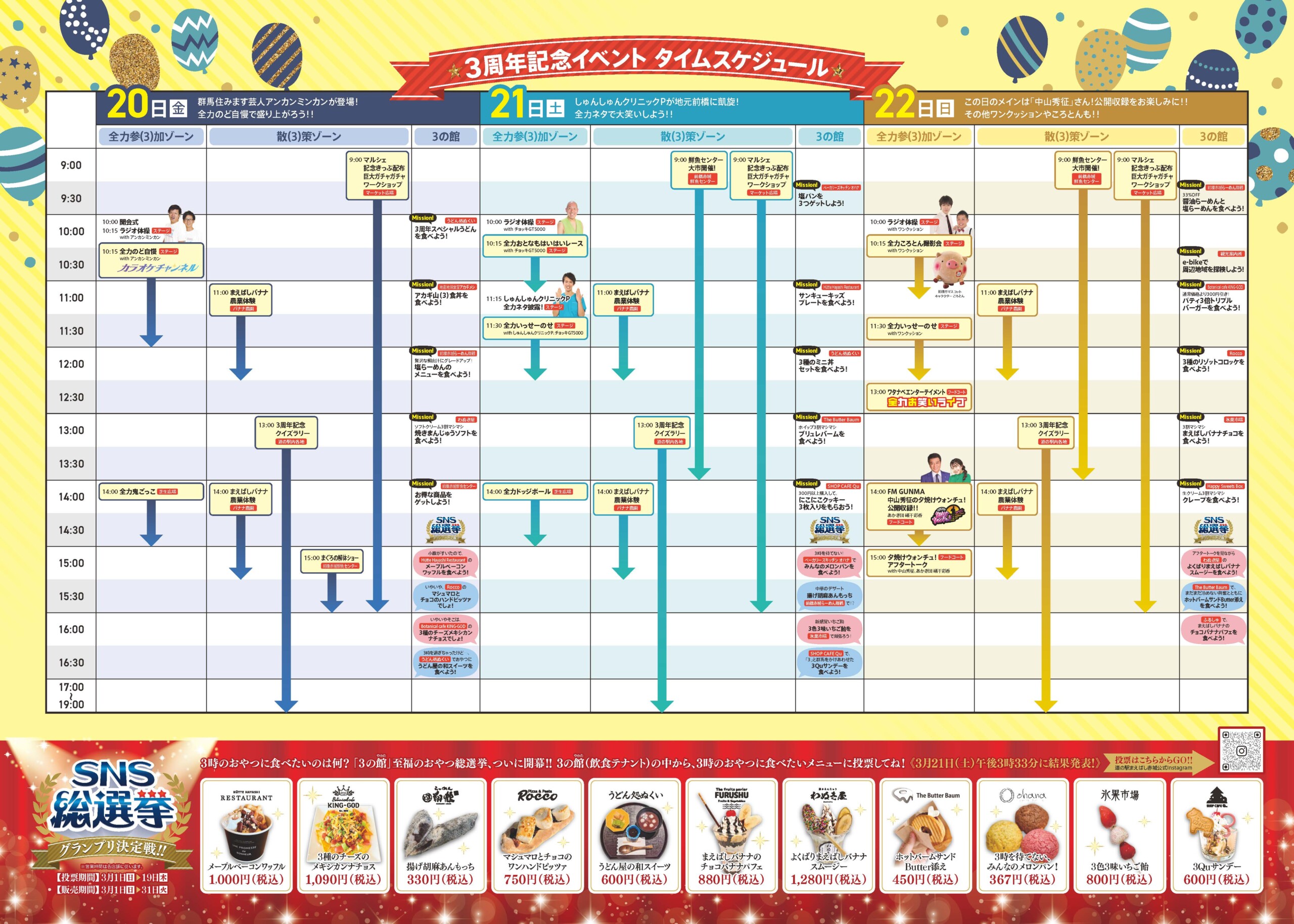 内容:道の駅まえばし赤城の各飲食店が、3にちなんだサービスを提供します。3割増や3個セットなど期間限定で大サービス!
