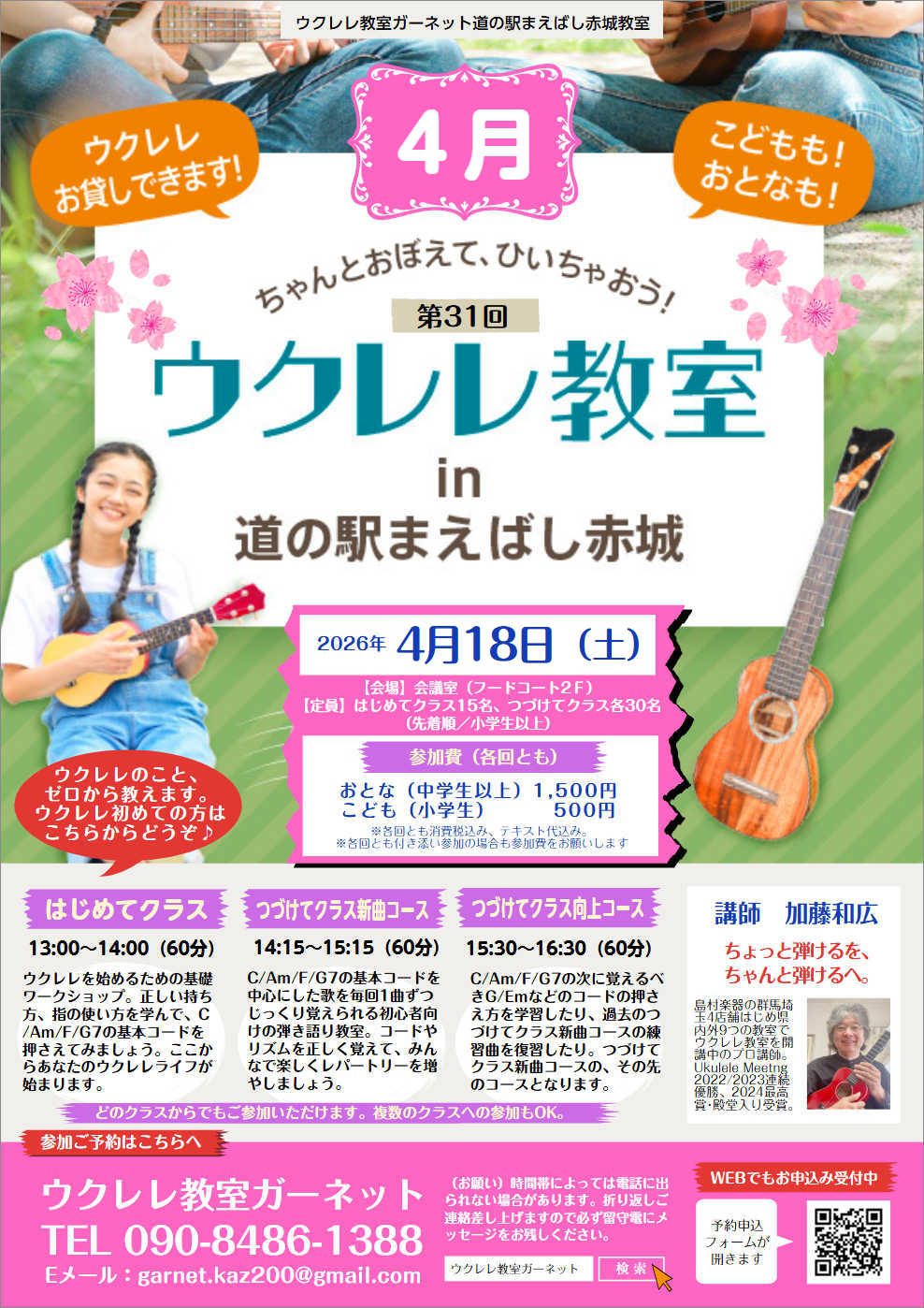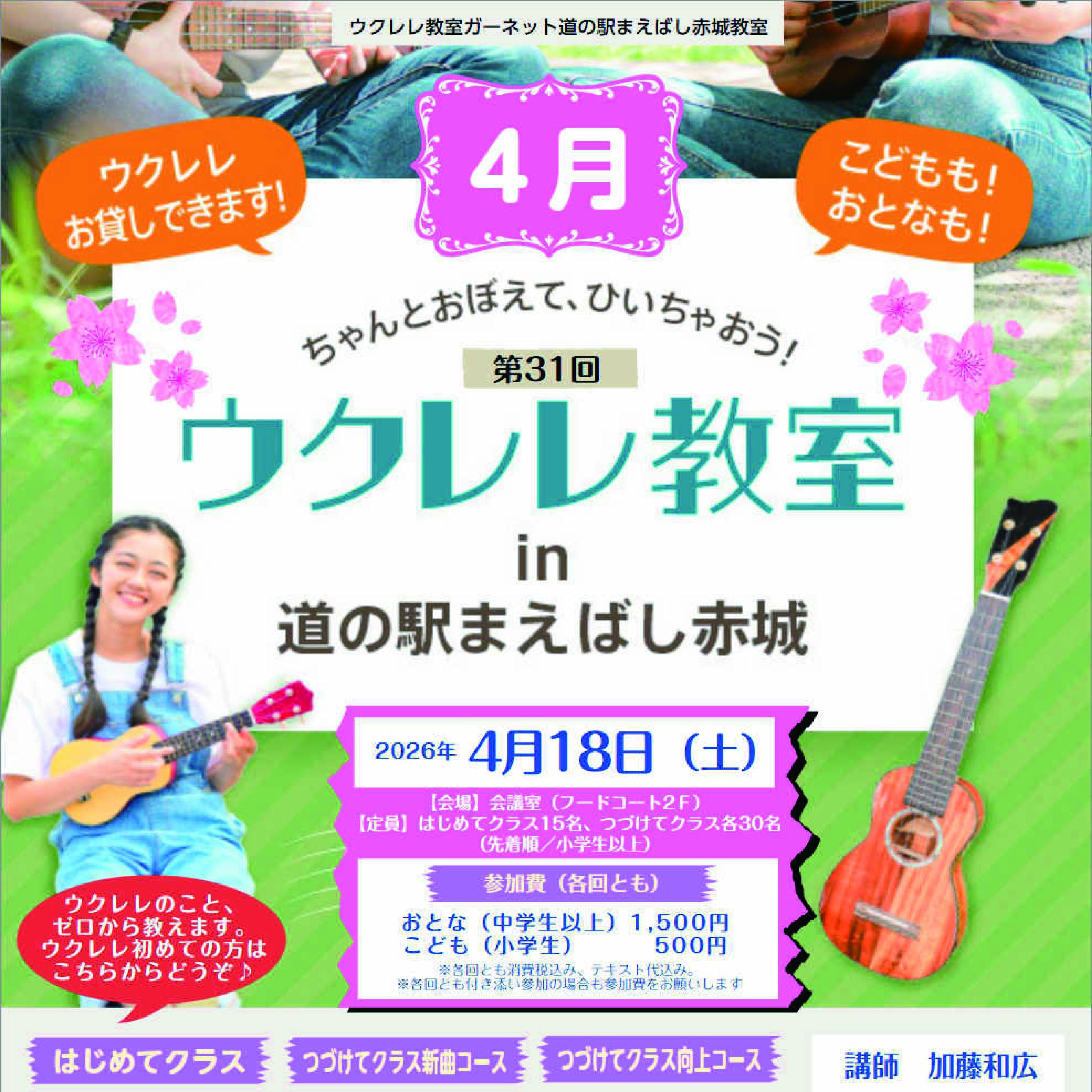 ウクレレの国内生産は約7割以上が群馬県! そこで!プロウクレレ講師「Ukulelegarnet加藤和広」先生による「第30回 ウクレレ教室in道の駅まえばし赤城」。 2023年6月にスタートし、2024年からは毎月第3土曜日に定期開催しているこの大人気ウクレレワークショップを、2026年も継続開催します。 「これからウクレレを始めようかな」という入門者の方から、「ちょっと弾けるよ」という初心者・初級者の方まで、段階別に3つのクラスを設けて開催。「ちょっと弾ける」を「ちゃんと弾ける」へと丁寧にご指導いただけます! キッズからシニアまでどなたでもご参加OK。キッズ&パパママ、じいじもばあばも、どうぞご一緒に!ウクレレを触ったことのない方ももちろん大歓迎!マイウクレレをお持ちの方はお持ちください。(ウクレレをお持ちでない方にはお貸しします!) お早目のご予約をおすすめします!