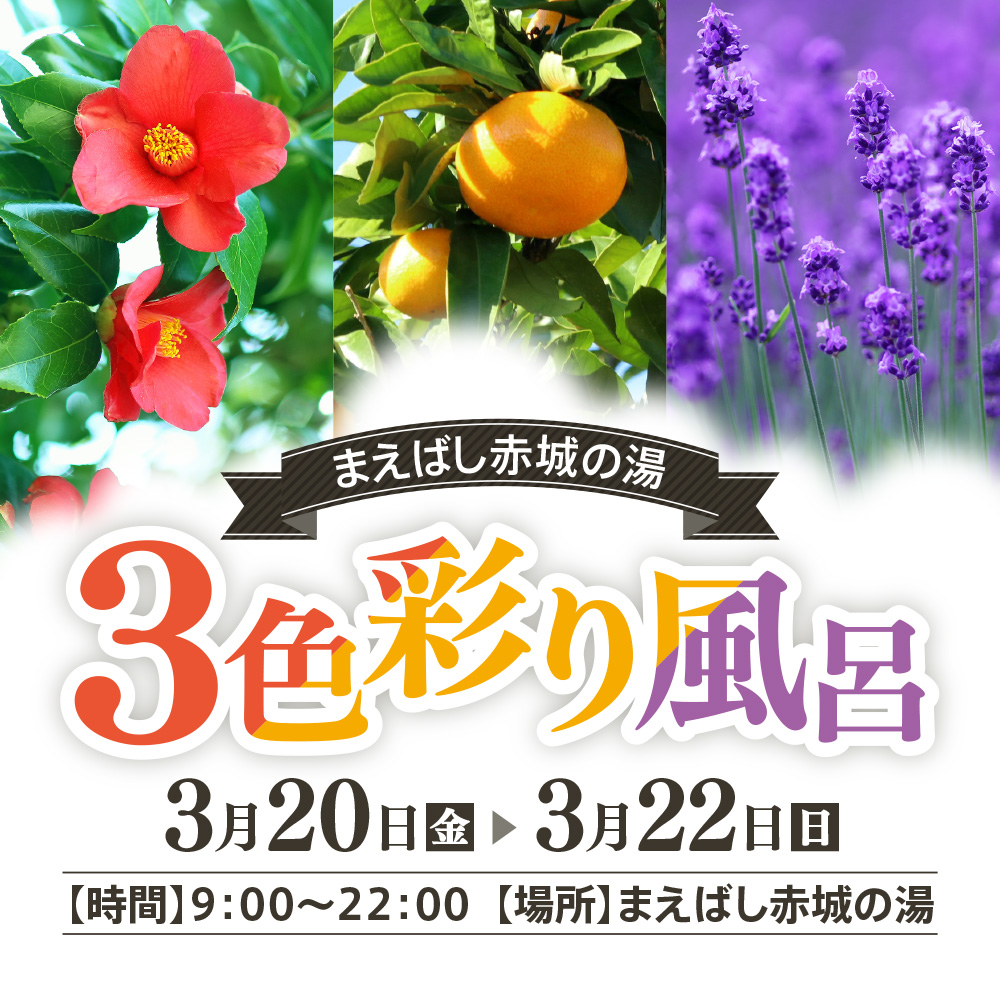 まえばし赤城の湯「3色彩り風呂」 2026/03/20[金] 2026/03/22[日] 概要・目的 ツバキ・オレンジ・ラベンダーの3色の入浴剤を使用した変わり湯イベント。 露天風呂・炭酸化粧水風呂・化粧水風呂の3か所が、彩り風呂に大変身! どのお風呂が何色かは当日のお楽しみ♪ 開催日時 期間:3/20(金)~3/22(日) 営業時間:9:00~22:00(最終入館 21:30) 場所 まえばし赤城の湯 まえばし赤城の湯 料金設定 以下の通りの区分とする。 入浴料(土日祝) 大人 700円 子供料金(小学生以下)350円 お問い合わせ先 まえばし赤城の湯 027-233-0075 チラシはこちら チラシはこちら
