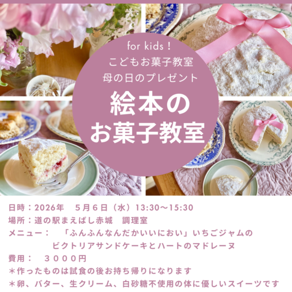 2026/04/24[金] 2026/05/02[土] よりみちMarket ~瀬戸内セレクトマーケット イクミ~【4/24-5/2】 2026/04/10[金] 2026/04/12[日] よりみちMarket ~小林屋製菓舗~【4/10-4/12】 EVENT COMPLETED 2026/04/03[金] 2026/04/05[日] よりみちMarket ~シウナススイーツ~【4/3-4/5】 2026/04/02[木] 2026/04/06[月] よりみちMarket ~SumerCH (スマーチ)~【4/2-4/6】 2026/04/23[木] 2026/04/23[木] チェアバレエ エクササイズ EVENT COMPLETED 2026/03/26[木] 2026/03/26[木] 実践!生きる力を引き出す、足と栄養 2026/05/16[土] 2026/05/16[土] 《第28回》和豚もちぶた料理教室 手打ちショートパスタ 和豚もちぶたのラグーソース 2026/04/25[土] 2026/04/25[土] 第48回 体操教室 みんなで身体を動かそう!【4/25】 2026/04/17[金] 2026/04/17[金] ベビーマッサージ【4/17】 2026/04/24[金] 2026/04/24[金] ベビーマッサージ【4/24】 2026/04/18[土] 2026/04/18[土] 腸活応援!発酵食品で健康生活!「味噌づくり体験教室」 2026/07/06[月] 2026/07/06[月] CCCに参加しよう!Cleanup and Coffee Club〜道の駅まえばし⾚城〜【7/6】 2026/05/04[月] 2026/05/04[月] CCCに参加しよう!Cleanup and Coffee Club〜道の駅まえばし⾚城〜【5/4】 2026/06/06[土] 2026/06/06[土] CCCに参加しよう!Cleanup and Coffee Club〜道の駅まえばし⾚城〜【6/6】 2026/04/17[金] 2026/04/17[金] 大人のための 絵本のお菓子教室【4/17】 2026/05/06[水] 2026/05/06[水] 【for kids!】絵本のお菓子教室【5/6】 EVENT COMPLETED 2026/04/04[土] 2026/04/04[土] ゲームつみ木大会【4/4】 2026/04/19[日] 2026/04/19[日] 【for kids!】こどものための絵本のお菓子教室 2026/05/19[火] 2026/05/20[水] ウクレレ教室in道の駅まえばし赤城・平日クラス【5/19・20】 2026/05/16[土] 2026/05/16[土] 第32回 ウクレレ教室 in道の駅まえばし赤城