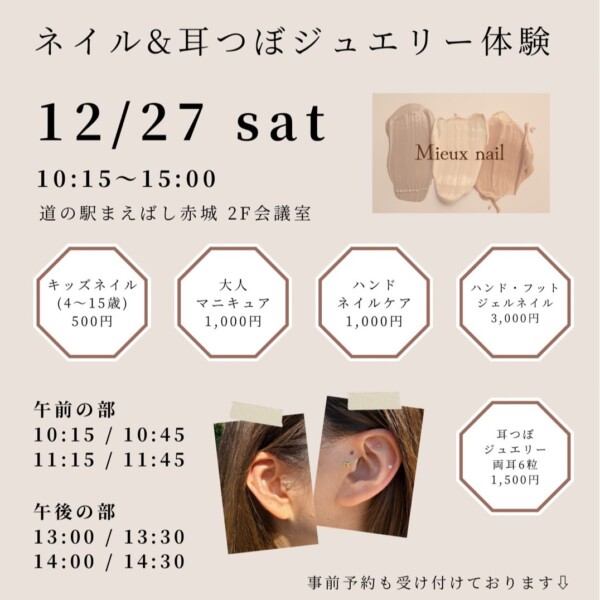 定期イベントREGULAR EVENTS まだ記事はありません。 2024/10/01[火] 2025/12/27[土] 学習指導教室 月2回 2025/11/11[火] 2025/11/11[火] 親子でDANCE LESSON【11月レッスン】 毎月第2・4火曜日 11:00~12:00 2025/11/11[火] 2025/11/11[火] 理学療法士と一緒にボディメイク体験 ストレッチ&運動教室 毎週水曜日 2025/11/12[水] 2025/11/12[水] プレニーテP.A.クラブーまえばし赤城教室ー 毎月第3土曜日 2025/11/15[土] 2025/11/15[土] 第27回ウクレレ教室in道の駅まえばし赤城 毎月1回 2025/11/15[土] 2025/11/15[土] 《第25回》和豚もちぶた料理教室 キッシュロレーヌと季節野菜のポタージュ 毎月第1・3土曜日 2025/11/15[土] 2025/11/15[土] 【筆ペンで描く】おのれ筆文字教室 2025/11/16[日] 2025/11/16[日] おいもみたいなクッキーとスイートポテトケーキ!【小学生対象】 2025/11/17[月] 2025/11/17[月] おいもみたいなクッキーとスイートポテトケーキ!【ママ&キッズ対象】 毎月第4火曜日 2025/11/18[火] 2025/11/18[火] Buggy YOGA【11/18】 毎月第1・第3の火曜・水曜 2025/11/18[火] 2025/11/19[水] ウクレレ教室in道の駅まえばし赤城・平日クラス【11/18・19】 毎週第3水曜日 2025/11/19[水] 2025/11/19[水] 羊毛フェルト教室【11/19】 毎週水曜日 2025/11/19[水] 2025/11/19[水] プレニーテP.A.クラブーまえばし赤城教室ー 毎月第3金曜日 2025/11/21[金] 2025/11/21[金] セルフメンテナンスヨガ【11月】 第2・4土曜日 2025/11/22[土] 2025/11/22[土] 第40回 体操教室 みんなで身体を動かそう!【11/22】 毎月第2・4火曜日 11:00~12:00 2025/11/25[火] 2025/11/25[火] 理学療法士と一緒にボディメイク体験 ストレッチ&運動教室 毎週水曜日 2025/11/26[水] 2025/11/26[水] プレニーテP.A.クラブーまえばし赤城教室ー 2025/11/27[木] 2025/11/27[木] 第19回 バレエ体操 月2回 2025/11/28[金] 2025/11/28[金] 誰でも簡単にDANCE LESSON【11月レッスン】 2025/11/28[金] 2025/11/28[金] まるでおいも!パンと干し芋ロールパン作り【平日大人レッスン】 毎月第1木曜日 2025/12/04[木] 2025/12/04[木] にこにこハイハイレース~12月~ 2025/12/08[月] 2025/12/08[月] 大人のためのクリスマスお菓子教室【大人対象】 毎月1回 2025/12/13[土] 2025/12/13[土] アロマワークショップ#9 クリスマスアロマワックスサシェ 第2・4土曜日 2025/12/13[土] 2025/12/13[土] 第41回 体操教室 みんなで身体を動かそう!【12/13】 毎週第3水曜日 2025/12/17[水] 2025/12/17[水] 羊毛フェルト教室【12/17】 毎月第3土曜日 2025/12/20[土] 2025/12/20[土] 第28回ウクレレ教室in道の駅まえばし赤城 2025/12/21[日] 2025/12/21[日] 親子のためのクリスマスお菓子教室【親子対象】 2025/12/23[火] 2025/12/23[火] 大人のためのクリスマスお菓子教室【大人対象】 開催中 2024/10/01[火] 2025/12/27[土] 学習指導教室 開催中 2025/02/01[土] 2025/12/31[水] まえばし赤城の湯 平日キャンペーン 開催中 2025/04/01[火] 2025/12/31[水] 定期イベント開催の募集 開催中 2025/09/07[日] 2025/12/28[日] まえばしバナナ農業体験※開催2日前までにご予約ください 開催中 2025/11/01[土] 2026/02/28[土] Maebashi Akagi Illumination 2025 開催中 2025/11/07[金] 2025/11/09[日] よりみちMarket ~小林屋製菓舗~【11月】 開催中 2025/11/07[金] 2025/11/09[日] よりみちMarket ~laugh~【11月】 開催予定 2025/11/08[土] 2025/11/08[土] 11月教室 腸活応援!発酵食品で健康生活!「味噌づくり体験教室」 開催予定 2025/11/08[土] 2025/11/08[土] あかぎ・de・マルシェ【11/8】 開催予定 2025/11/11[火] 2025/11/11[火] 親子でDANCE LESSON【11月レッスン】 開催予定 2025/11/11[火] 2025/11/11[火] 理学療法士と一緒にボディメイク体験 ストレッチ&運動教室 開催予定 2025/11/12[水] 2025/11/12[水] プレニーテP.A.クラブーまえばし赤城教室ー 開催予定 2025/11/12[水] 2025/11/15[土] よりみちMarket ~La mignonne~ 開催予定 2025/11/15[土] 2025/11/15[土] 第27回ウクレレ教室in道の駅まえばし赤城 開催予定 2025/11/15[土] 2025/11/15[土] 《第25回》和豚もちぶた料理教室 キッシュロレーヌと季節野菜のポタージュ 開催予定 2025/11/15[土] 2025/11/15[土] 【筆ペンで描く】おのれ筆文字教室 開催予定 2025/11/16[日] 2025/11/16[日] おいもみたいなクッキーとスイートポテトケーキ!【小学生対象】 開催予定 2025/11/16[日] 2025/11/20[木] よりみちMarket ~瀬戸内セレクトマーケット イクミ~【11/16-11/20】 開催予定 2025/11/17[月] 2025/11/17[月] おいもみたいなクッキーとスイートポテトケーキ!【ママ&キッズ対象】 開催予定 2025/11/18[火] 2025/11/18[火] Buggy YOGA【11/18】 開催予定 2025/11/18[火] 2025/11/19[水] ウクレレ教室in道の駅まえばし赤城・平日クラス【11/18・19】 開催予定 2025/11/19[水] 2025/11/19[水] 羊毛フェルト教室【11/19】 開催予定 2025/11/19[水] 2025/11/19[水] プレニーテP.A.クラブーまえばし赤城教室ー 開催予定 2025/11/21[金] 2025/11/21[金] セルフメンテナンスヨガ【11月】 開催予定 2025/11/21[金] 2025/11/24[月] よりみちMarket ~JOY PLAN~ 開催予定 2025/11/22[土] 2025/11/22[土] ととキャリ 開催予定 2025/11/22[土] 2025/11/22[土] 第40回 体操教室 みんなで身体を動かそう!【11/22】 開催予定 2025/11/22[土] 2025/11/22[土] ネイル体験【11/22】 開催予定 2025/11/22[土] 2025/11/22[土] あかぎ・de・マルシェ【11/22】 開催予定 2025/11/25[火] 2025/11/25[火] 理学療法士と一緒にボディメイク体験 ストレ