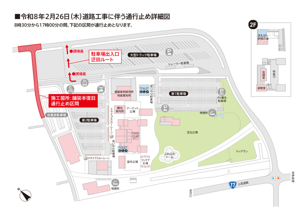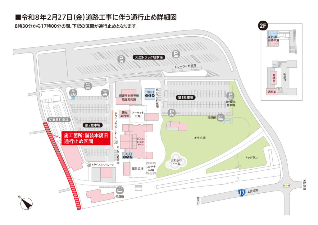 当道の駅にお越しになる際は、下記の詳細図をご覧いただき、上武道路や北側四ツ塚線等からの迂回をお願いいたします。